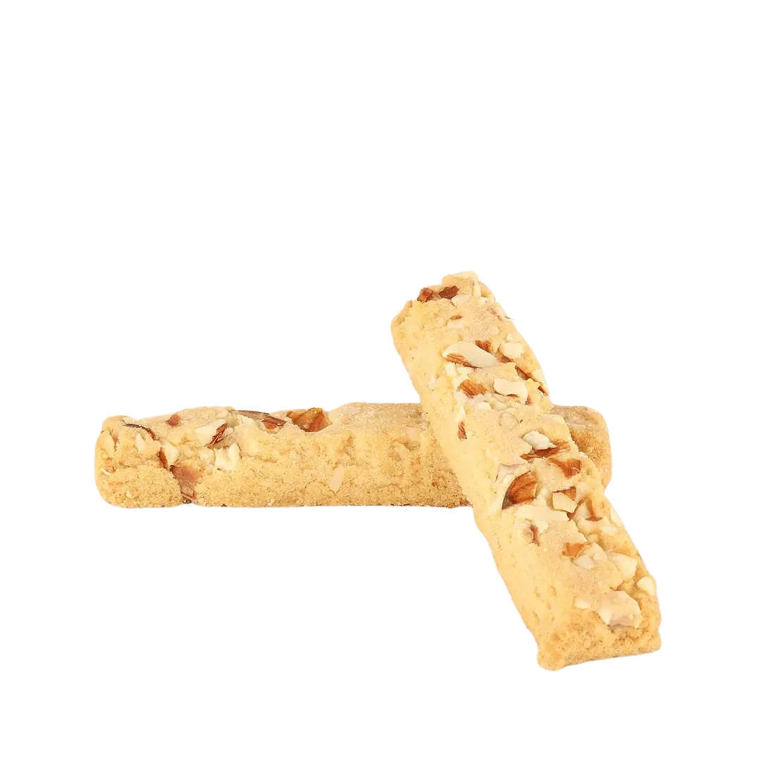 Almond sticks are crisp, elongated cookies with a delightful nutty flavor. They are typically shaped like thin sticks or bars, often studded with slivers of almonds, and have a buttery, slightly sweet taste. The crunchy texture and rich almond essence make them a perfect snack or accompaniment to coffee or tea.